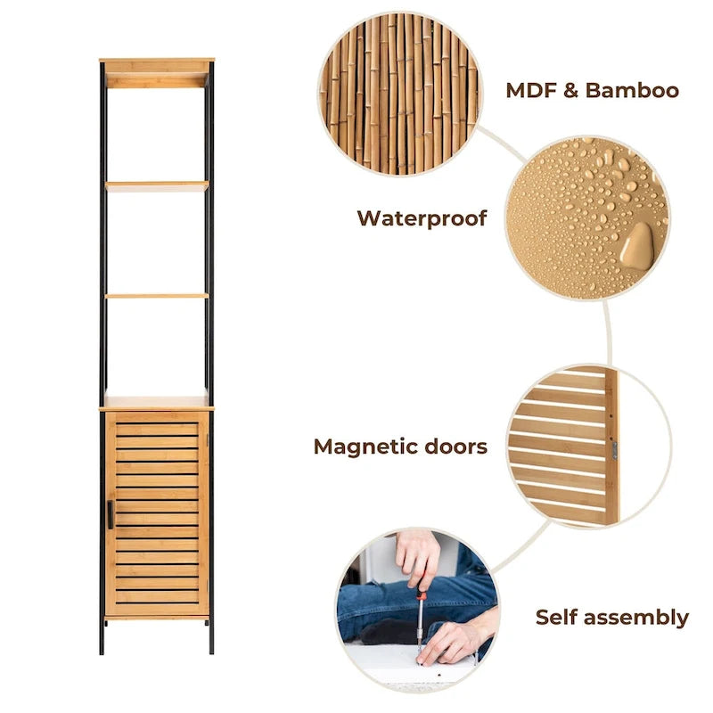 Upgrade your home organization with this narrow freestanding storage cabinet designed for modern spaces. Featuring a sleek black frame, it blends seamlessly into any dcor. Additionally, the vented door provides a stylish yet functional touch, keeping stored items fresh. Moreover, this tall space-saving tower includes three open shelves for easy access to essentials. Store towels, toiletries or decorative items while maintaining a clutter-free environment. Furthermore, the lower enclosed cabinet keeps personal items discreetly tucked away. Besides its stylish look, this slim shelving unit is crafted from durable MDF and bamboo. Plus, the magnetic door closure enhances security, keeping stored items safe. Notably, its versatile design suits various rooms. Place it in the bathroom for towels, the kitchen for pantry storage or the entryway for essentials. In addition, its narrow profile fits tight spaces without overwhelming the room. For added safety, the included wall-mount anchor ensures extra stability. Assembling this compact storage tower is simple with clear instructions. Ultimately, this modern freestanding organizer provides a perfect blend of functionality and style for your home.